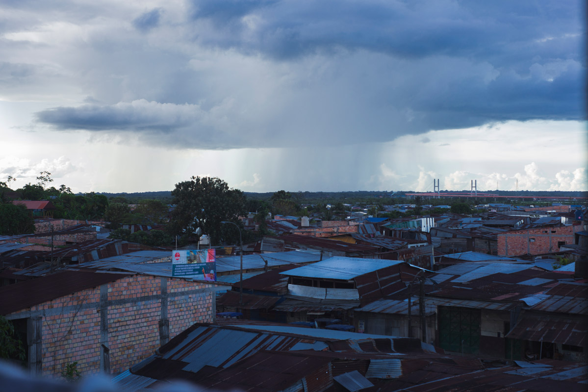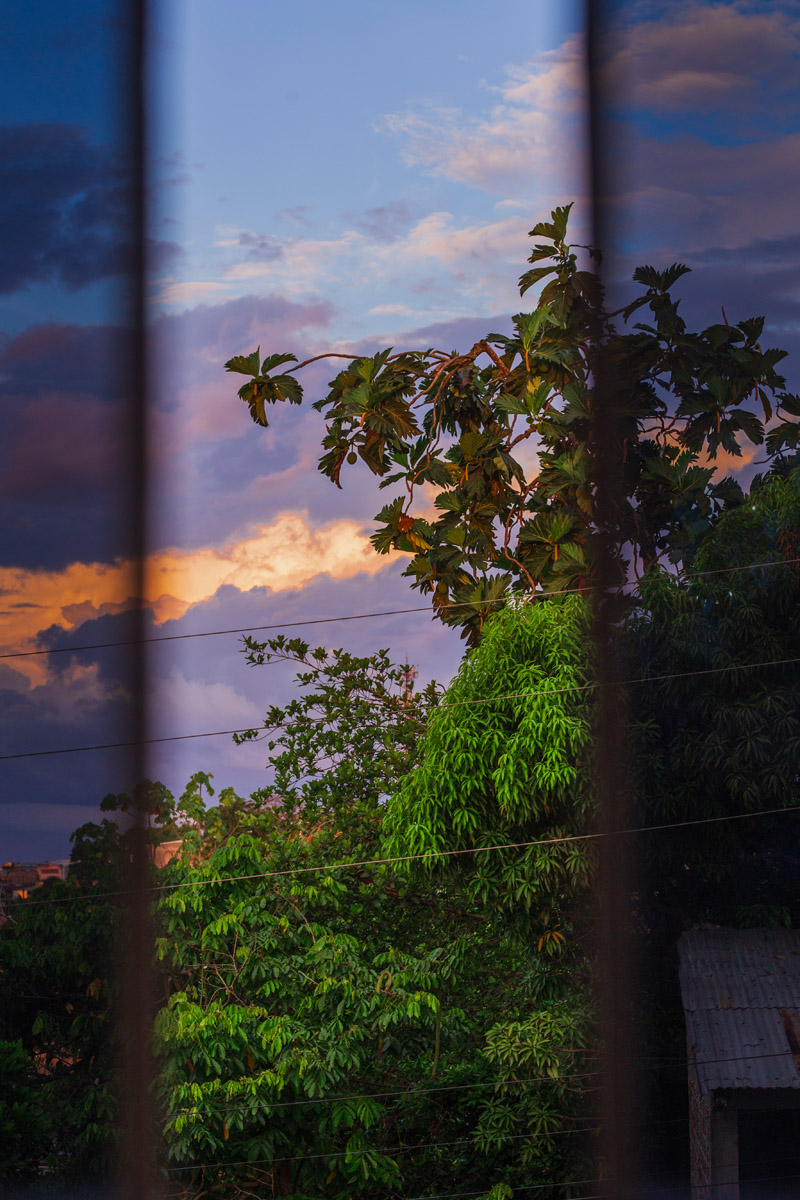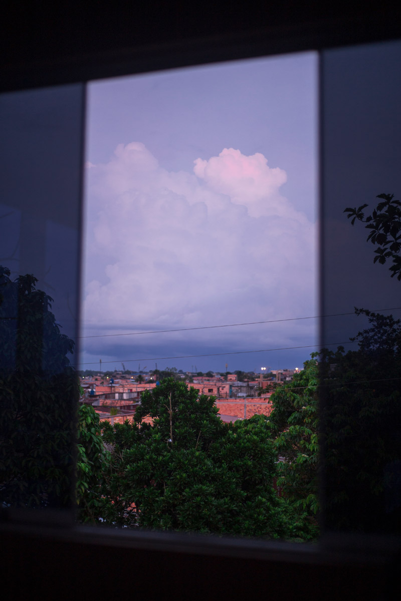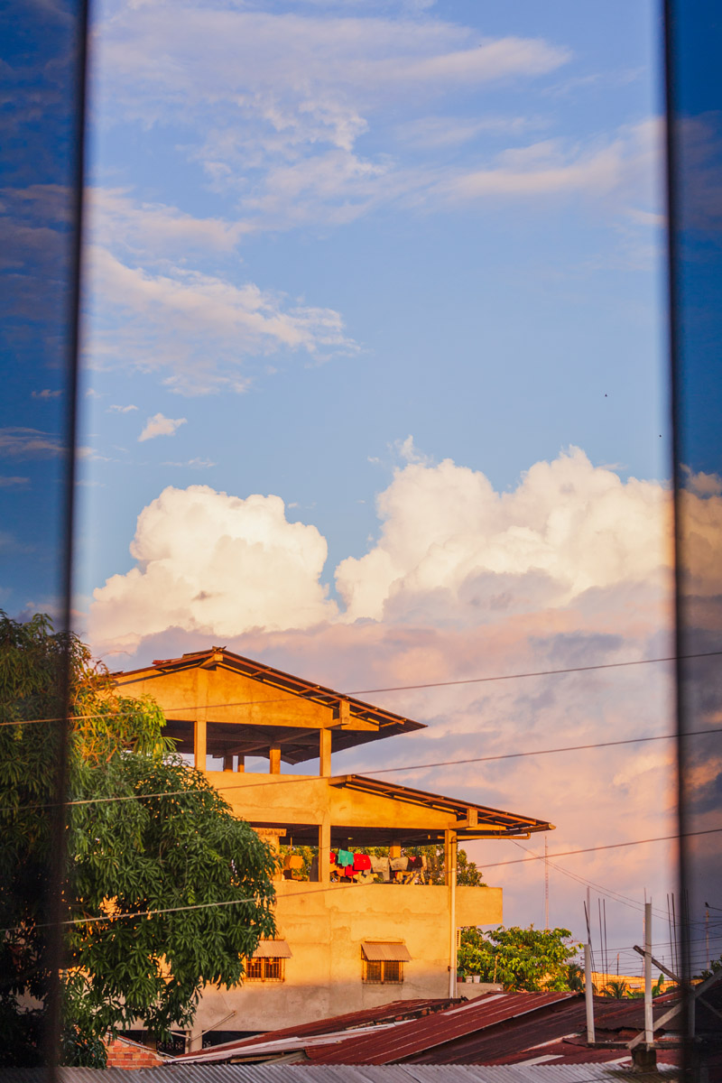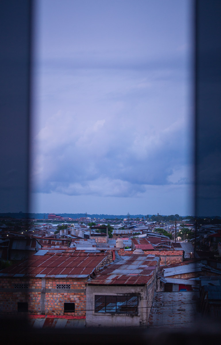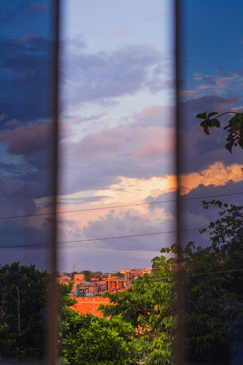La Ventana Amazónica is a series of photographs taken between March and June 2024, while I was living in a hostel in Iquitos. Iquitos is the only real city in the heart of the north Peruvian Amazon Forest. There are no direct roads to this place. You have to get there by boat or by plane. The great thing about this hotel room I had was that it had three large windows. Each of them looked out onto a different side of the barrio. The room was on top of a small hill. I was always captivated by the view, as well for the visual and audio. I could hear the sounds of tropical birds and insects mixed with the rumble of mototaxis, sometimes voices and latin music from neighbourhood parties, sometimes the rain heavily falling on iron roofs. Each day was a totally different visual mood. One day, it was dramatic red sunset; other day it was yellowish fog; other days the view was so blended in pastel tones that it seemed surreal.