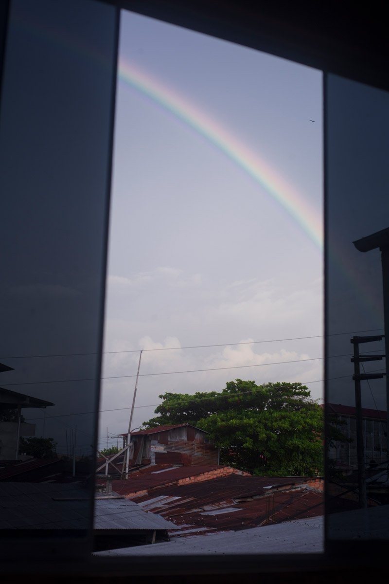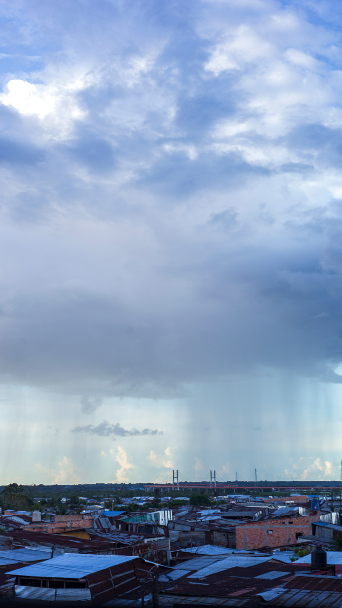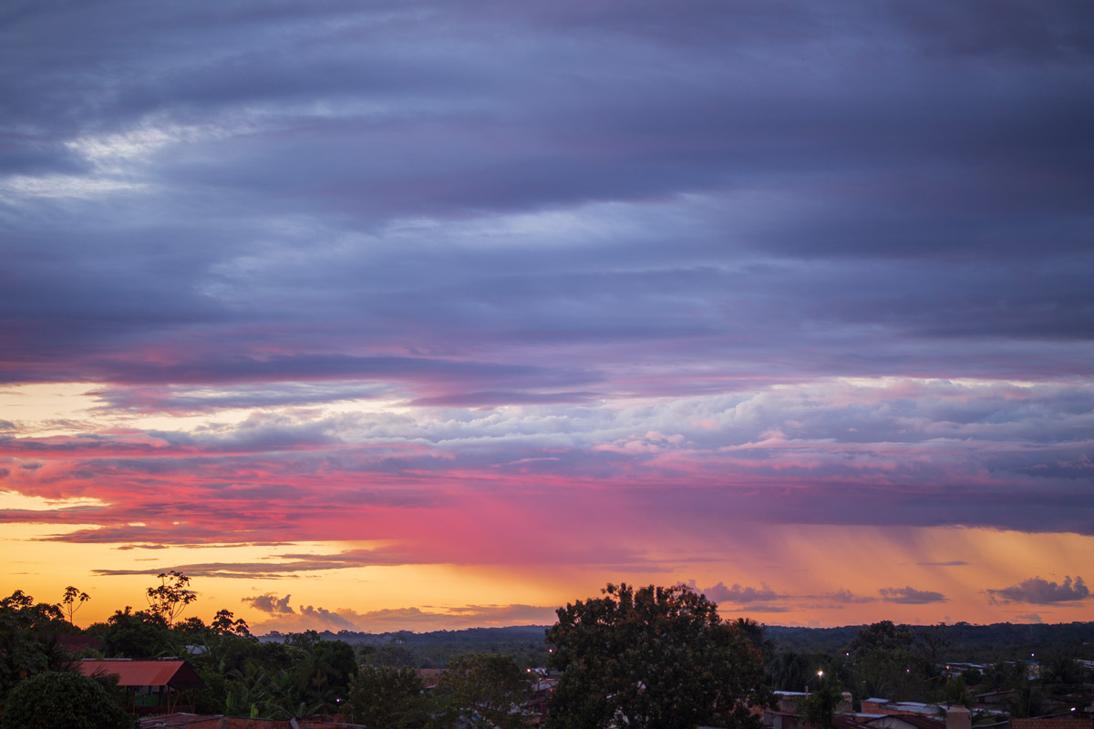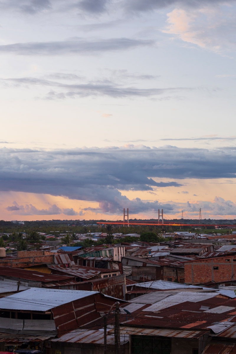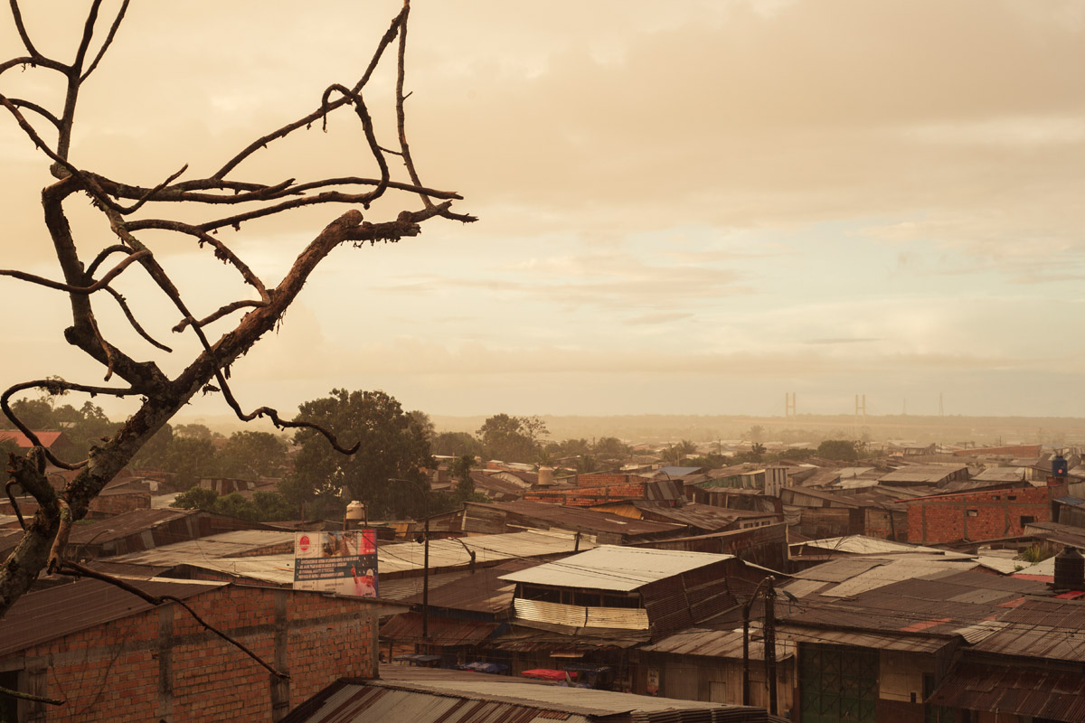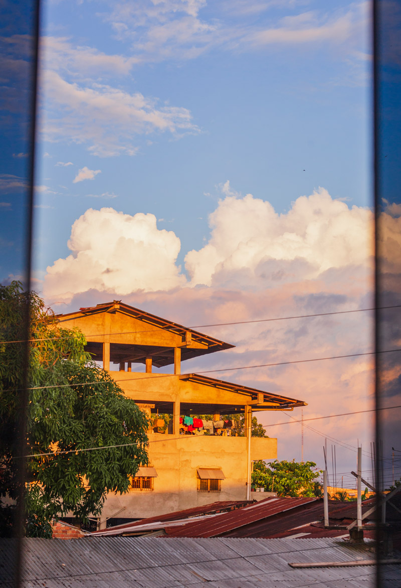 La Ventana Amazónica is a series of photographs taken between March and June 2024, while I was living in a hostel in Iquitos. Iquitos is the only real city in the heart of the north Peruvian Amazon Forest. There are no direct roads to this place. You have to get there by boat or by plane. The great thing about this hotel room I had was that it had three large windows. Each of them looked out onto a different side of the barrio. The room was on top of a small hill. I was always captivated by the view, as well for the visual and audio. I could hear the sounds of tropical birds and insects mixed with the rumble of mototaxis, sometimes voices and latin music from neighbourhood parties, sometimes the rain heavily falling on iron roofs. Each day was a totally different visual mood. One day, it was dramatic red sunset; other day it was yellowish fog; other days the view was so blended in pastel tones that it seemed surreal.